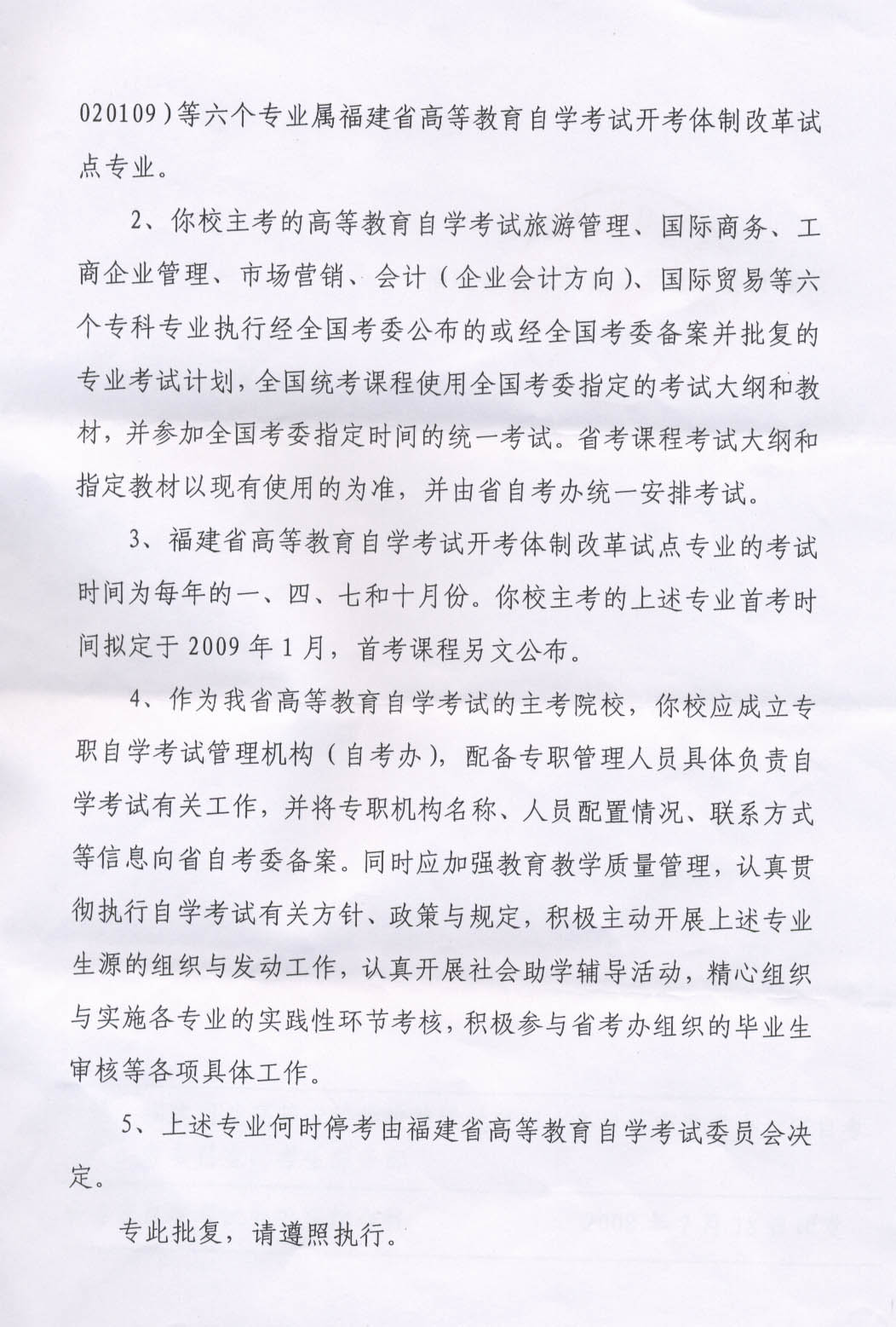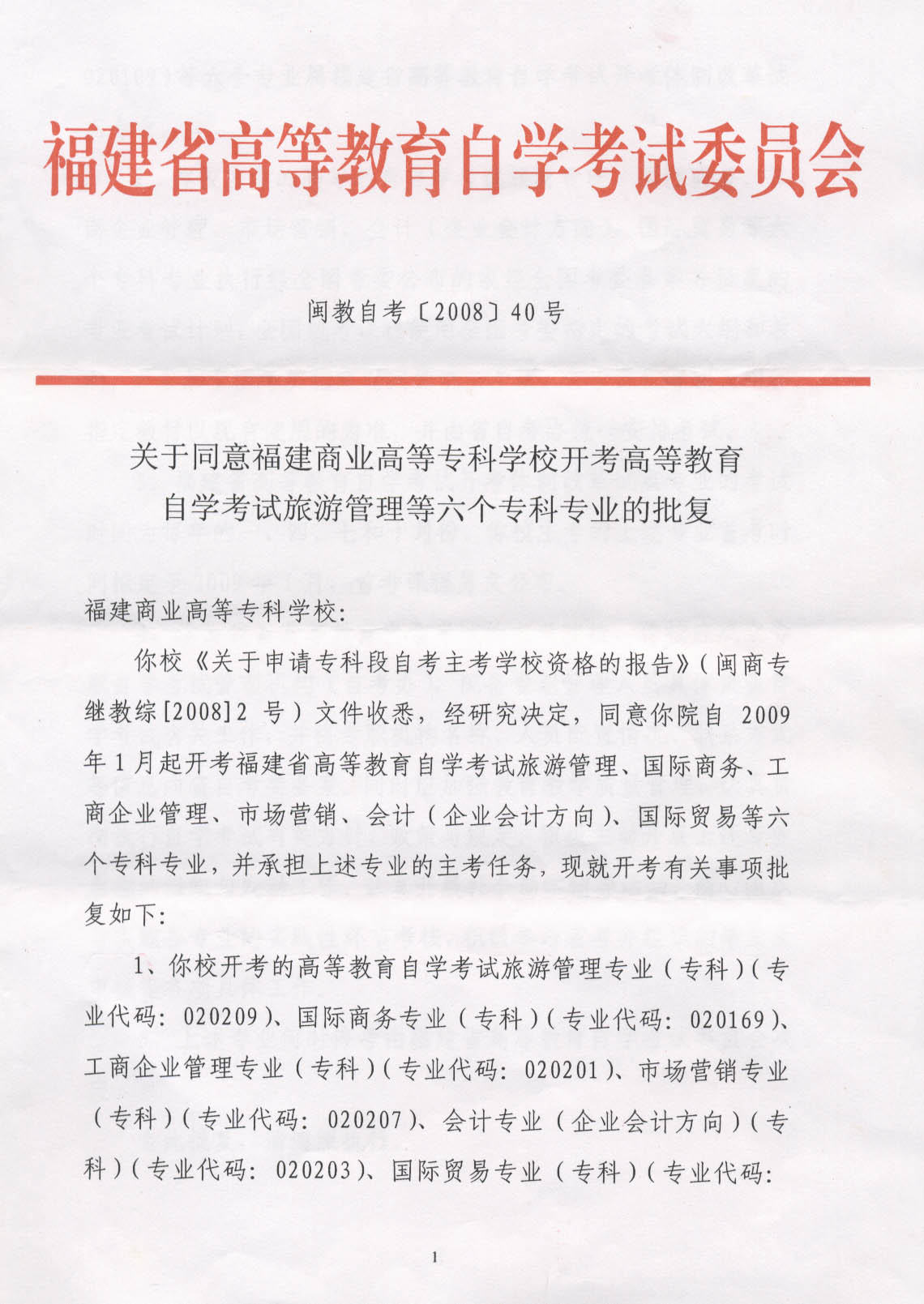 福建省教育考试院关于同意福建商业高等专科学校开展高等教育自学考试工商企业管理